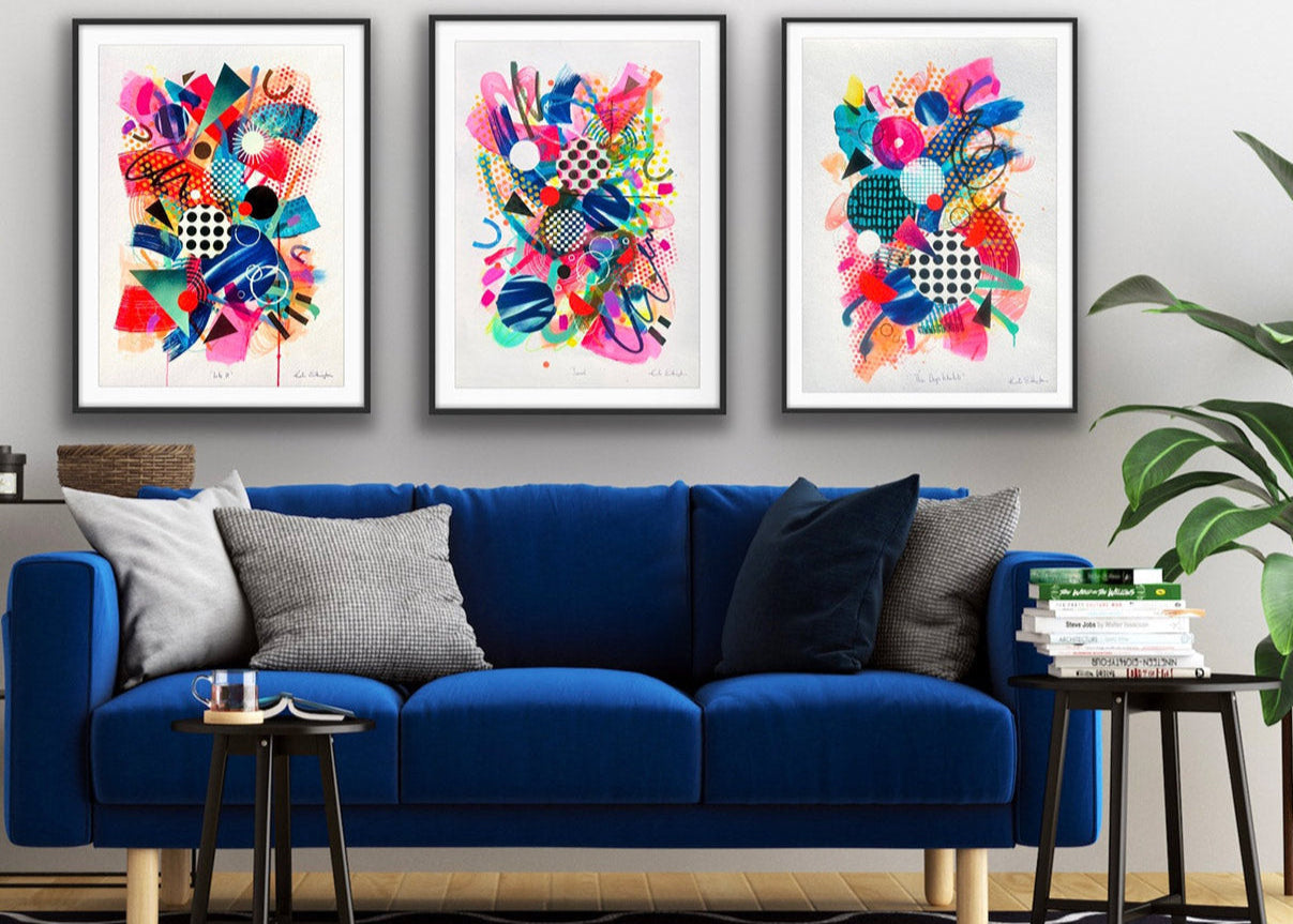 Create an impactful, statement gallery wall in your home with a discounted set of vibrantly colourful, cohesive, fine art prints which work together to create a seamless yet bold focal point.