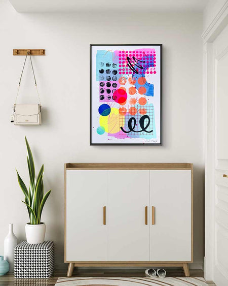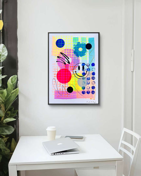My vibrant, original artworks are made on thick quality water colour paper using a wide range of materials and techniques - watercolour paints, inks, acrylic paint, spray paint, chunky pencils, fat marker pens, posca pens, tempur paint sticks and oil sticks.