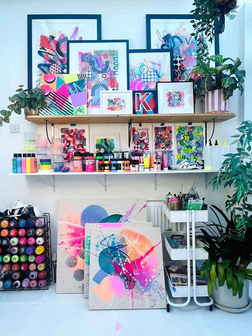 I’m a big believer in keeping my materials out on display rather than hidden away in cupboards or boxes. To me, they’re beautiful objects in their own right, and seeing them laid out on my shelves often sparks fresh ideas. Having my paints, pens, and tools visible is a constant reminder of what’s possible and keeps my creative energy flowing.